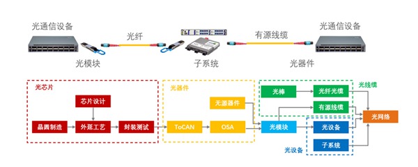 光通信的产业链,上游包括芯片设计、芯片设计制造代工等,中游主要包括光器件、光模块企业,下游客户包括设备商、运营商和云企业等。