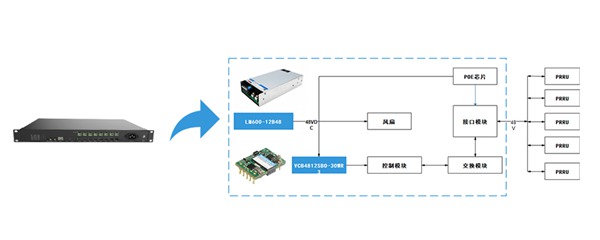 如上图:一个集线器单元最多要支撑带8个PRRU,需要提供大的功率输出,使用金升阳开关电源LM600-12B48可以提供相应的负荷要求,满足1U机箱需求的高度和体积并提供大功率输出,如需要更大的功率还可以灵活使用金升阳1000W的机壳产品,减小在远端供电带来的压降损耗。