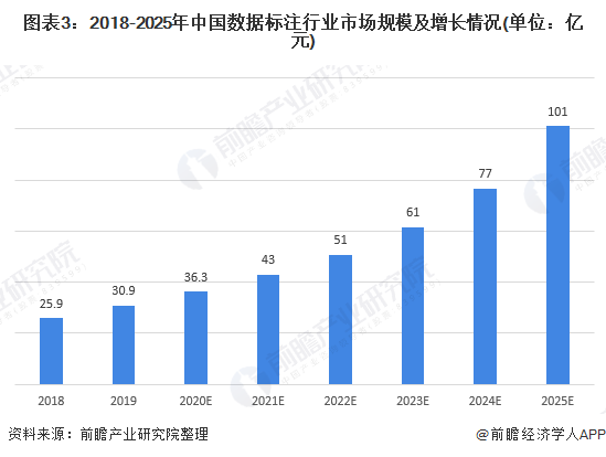 从数据标注产业来看,到2019年,数据标注行业市场规模为30.9亿元,到2020年行业市场规模突破36亿元,预计2025年市场规模将突破100亿元,说明我国数据标注行业处于高速发展阶段。