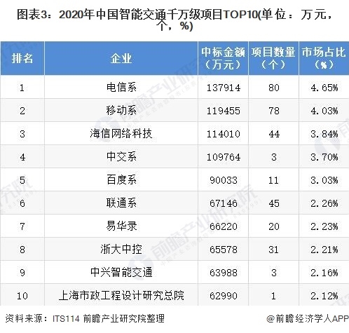 2020年我国智能交通千万项目中标市场规模排在前10的企业总计市场规模89.71亿,同比上升51.10%;项目数总计316个,前十中标企业千万项目市场规模约占总市场的30.30%,相比2019年的25.4%有所上升;约有900家企业分享1400个除公路信息化以外的智能交通千万项目。