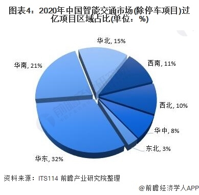 2020年城市智能交通市场(除停车项目)中标过亿项目32个,中标过亿项目市场规模总计约为66.58亿。从区域分布上来看,华东项目占比最多,为32%,其次是华南和华北,占比分别为21%和15%,西南、西北、华中和东北的占比分别为11%、10%、8%和3%。