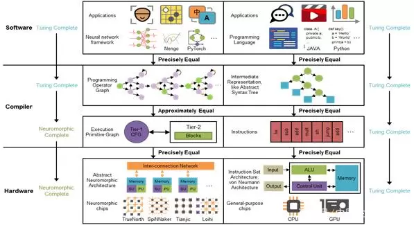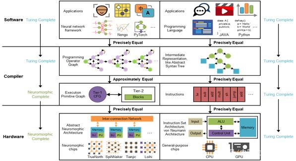 这篇题为《一种类脑计算系统层次结构》的论文,由清华大学计算机科学与技术系张悠慧团队、精密仪器系施路平团队与合作者共同完成。首次提出“类脑计算完备性”(也称为神经形态完备性)概念――针对任意给定误差∈≥0和任意图灵可计算函数f(x),如果一个计算系统可以实现函数F(x)使得‖F(x)-f(x)‖≤∈对所有合法的输入x均成立,那么该计算系统是类脑计算完备的。类脑计算机层次结构(左)与现有通用计算机(右)的对比。
