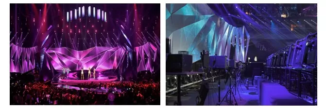 在展览展示和舞台演出中,利用异形舞台,营造光影氛围,虚拟实境等等,高端工程投影机的应用也及为广泛,例如欧洲歌唱大赛(简称ESC)中就用到了60台巴可高亮度投影机承担舞美显示,此次欧歌赛得到业内广泛瞩目,得益于舞台大胆地摒弃了传统LED显示屏,主要原因是主屏幕不是普通的平面幕,在屏幕表面有非常多的菱形突起,如果使用LED的话在突起部分会有拼缝,整个舞台背景的一致性就会有所破坏。最终在巴可高亮投影机的协助下,呈现给观众超大无缝平滑亮丽的画面,这是LED所无法企及的。另外在舞台演出的运用中,高亮度的投影机不仅在背景屏幕上,在渲染整个会场的光影效果、在歌手服装或者道具上投射出影像等方面也同样效果出色。