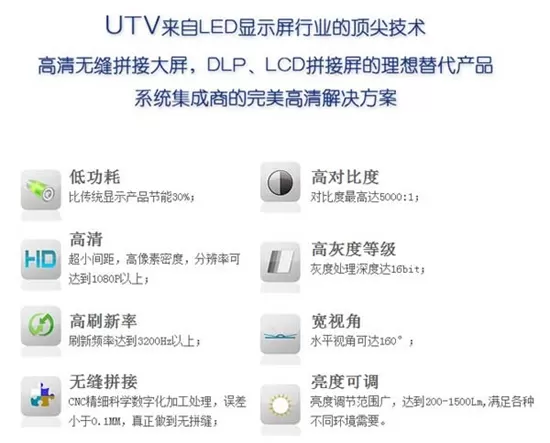 该系列产品比一般显示屏有着更宽的色域空间和更快响应速度、可实现任意大小尺寸无缝拼接、模块化维护。其播放的整个画面色彩均匀,高清逼真,没有普通显示屏常见的汗斑、亮线等不正常显示,画面切换柔和不闪烁,画质非常细腻,直逼电视机的播放效果。UTV系列产品除了在低亮高灰技术领域的突破,该产品还保持了洲明一贯对高品质的坚持:该系列显示屏拥有3200Hz的刷新频率,这个数字不仅超过了DLP和LCD显示屏的刷新屏率,(后两者的刷新屏率只有大约 120Hz),而且在同类产品中也是一个高品质的象征。对比度5000:1在黑屏状态下可呈现出绝佳的黑度,更是同类产品中的佼佼者。