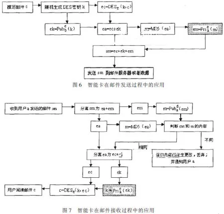 在图6的邮件发送处理流程中,灰色框中的处理步骤是邮件发送方以私钥加密邮件内容摘要处理结果。这个步骤是在智能卡内处理,加密之后再将结果返回给外部邮件代理程序。这样外部的程序就不能直接访问用户的私钥,从而可以在最大的程度上保证私钥的安全性。而在之前进行的加密过程是由外部邮件代理程序完成的,其先从%&服务器上获取邮件接收者的公钥,之后对密钥加密。由于用户的公钥是公开的,在智能卡外部加密可以充分利用外部客户端的资源,提高了加密速度,而且安全性也不会降低。