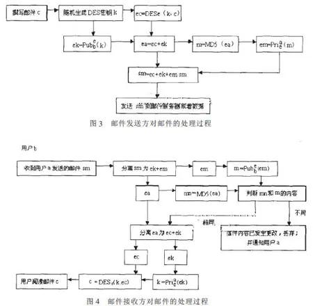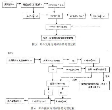 在图7的邮件接收处理流程中,灰色框中表示以邮件接收方私钥.对解密的过程。外部邮件代理程序将发送给智能卡,经过卡内解密得到密钥,返回给外部邮件代理程序,邮件的解密过程在外部客户端实现,同样避免邮件代理程序直接访问到用户的私钥,最大限度地提高系统整体效率和安全性。