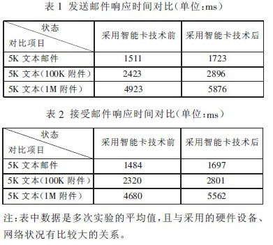 通过对比,可以看出在邮件系统中采用文中介绍的模型处理邮件,不但安全性得到了保证,而且损失的性能也是可以接受的。这证明了所提出的模型算法相结合,大量邮件数据解密,少量的敏感信息用2)&算法在智能卡内加解密的思想是非常有效的。
