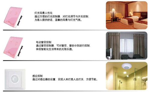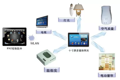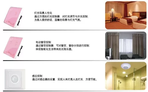 网关根据不同场景启动相应的动作,控制灯光、空调、电动窗帘等系统启用。控制方式也可以用手机、PAD等控制。