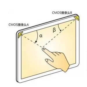 光学影像技术是近几年快速发展起来的适合中大尺寸触摸屏的新型触摸技术,其工作原理是在触摸屏相邻边角上放置两个摄像头,通过摄像头连续不断地捕捉触摸表面上的物体移动变化对红外线的影响来进行定位。当触摸表面上的物体进行点击或移动等操作时,摄像头会根据物体对光线的遮挡情况快速确定触摸位置,进而准确判断触摸点或对触摸的手势动作进行分析,实现相应的功能操作。
