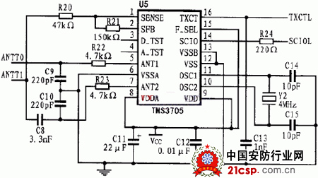 本文研制的射频识别系统是以美国德州仪器公司的TMS3705为射频信号读写芯片,并以该公司的RI-TRP-RR2B(只读型)作为应答器。该设计中的基站芯片与微处理器(MCU)的通信只需两根通用I/0口线即可,因而使用起来十分方便。调制解调电路如图1所示。