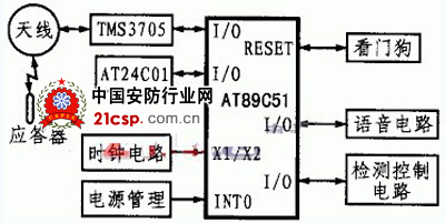 该系统以ATMEL公司的AT89C51单片机为核心,其硬件组成如图2所示。该系统由射频识别装置、外部存储器、语音电路、时钟电路、电源管理电路、看门狗和检测控制电路组成。此系统的兼容性很高,可与其它防盗器配套使用,是一种性价比较高的汽车防盗装置。该防盗报警系统的主要功能特点如下: