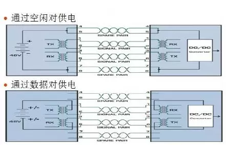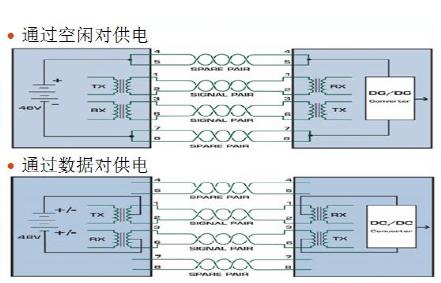 POE是通过CAT.5及以上的网线,在差分线上传输数字网络信号的同时,给PD端进行供电。POE供电方式通常有2种方式,如下图所示:第一种用到8芯网线,利用4、5、6、7号空闲端进行电源传输,信号与电源是分开传输;第二种用到4芯网线,即利用1、6数据端即传输电源也传输数字信号,实现信号与电源叠加传输。