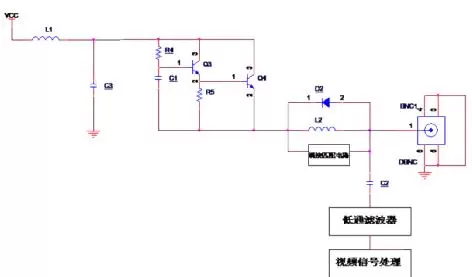 通过外部偏置参数的设置使三极管Q3,Q4处于放大区,使Q4的管脚3电压高于管脚1电压,管脚1电压高于管脚2,这样供电电流经过Q3,Q4放大后,通过Q4的3,2管脚流向电感L2。但对于高清模拟视频而言,属于交流信号,C1低阻抗,利用三极管在放大区的特性(流经三极管1,2管脚的电流决定了流经3,2的电流)以及R5的高阻抗,使流经Q3、Q4的电流极小,可以忽略不计,高清视频信号在经过该模块时感受到的阻抗约等于R4。通过设置R4的阻值可以实现对高清模拟视频高阻抗的目的。其精髓是将三极管设定为放大状态,利用三极管在放大区的特性,实现对模拟高清视频信号表现为高阻抗,从而使得在不同频谱段的视频信号保持衰减恒定。