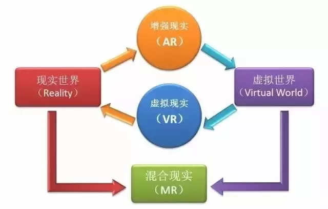 现实世界叠加部分虚拟内容,丰富现实世界,就是增强现实(AR),最终达到虚拟世界。虚拟世界营造部分现实感觉,让人身临其境,就是虚拟现实(VR),最终达到现实世界。而混合现实(MR)是现实世界和虚拟世界的融合,并且强调现实和虚拟的互动 。