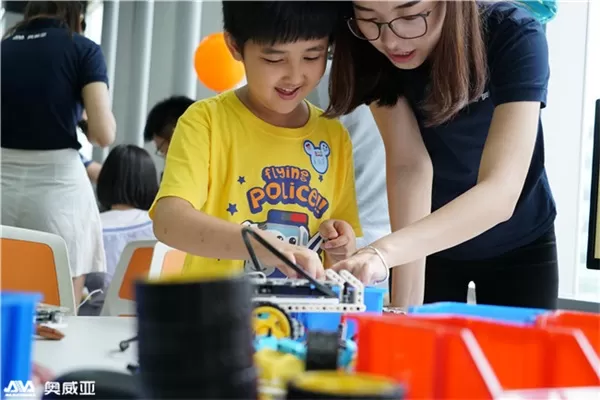 而第二小组,7岁到10岁的孩子则会交给专业的辅导老师,挑战难度更高的战车乐高玩具。第二组的战车模型的乐高玩具是一个包括塑料积木、电子模块、手动遥控器等几十种零件的工程积木。孩子可以在家长、辅导老师的指引下,充分发挥自身的空间想象能力和动手操作能力,将零散的积木变成可移动、可遥控的战车玩具。