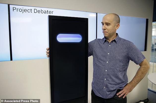 图为首席研究员诺姆•斯洛尼姆站在人工智能机器Project Debater旁边。该机器即将在接下来于旧金山展开的辩论赛中与两名人类对决。斯洛尼姆在程序中加入了幽默元素,但机器有时会在不合适的时机开玩笑。