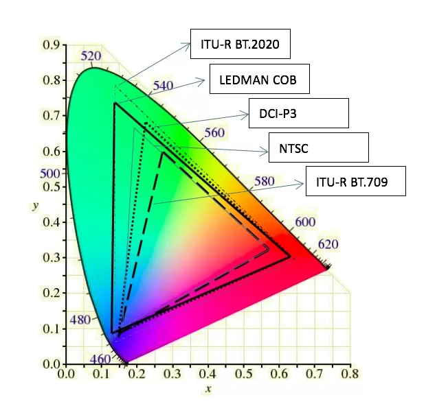 从上图可以看到,LEDMAN COB的色域三角形,与ITU-R BT.2020的色域标准相比,主要是LED绿光芯片的波长范围有些差异,但可以通过与芯片厂家协同开发,调整红、绿、蓝三种LED芯片的波长范围及其它参数,就可以做到尽量覆盖ITU-R BT.2020的色域范围,相对来说是比较容易实现。因此基于COB技术的Micro LED微显示可以实现接近或达到ITU-R BT.2020的色域范围,色域越大,能够表现的颜色更丰富,更能还原自然界千姿百态的颜色。