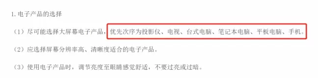 日前,国家卫生健康委发布了《儿童青少年新冠肺炎疫情期间近视预防指引》,对电子产品的选择优先次序做出了规范,《指引》指出:“尽可能选择大屏幕电子产品,优先次序为投影仪、电视、台式电脑、笔记本电脑、平板电脑、手机。”