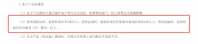 国家卫生健康委发布的《指引》显示“使用投影仪时,观看距离应在3米以上;使用电视时,观看距离应在屏幕对角线距离的4倍以上;使用电脑时,观看距离应在50厘米(约一臂长)以上。”