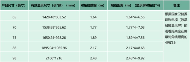 根据卫健委《指引》指示,使用电视时,观看距离应在屏幕对角线距离的4倍以上。由数据计算,65英寸电视的要求观看距离应为6.56米;70英寸电视要求观看距离应为7.08米;75英寸电视的要求观看距离应为7.56米;86英寸电视的要求观看距离应为8.68米;98英寸电视的要求观看距离应为9.92米。