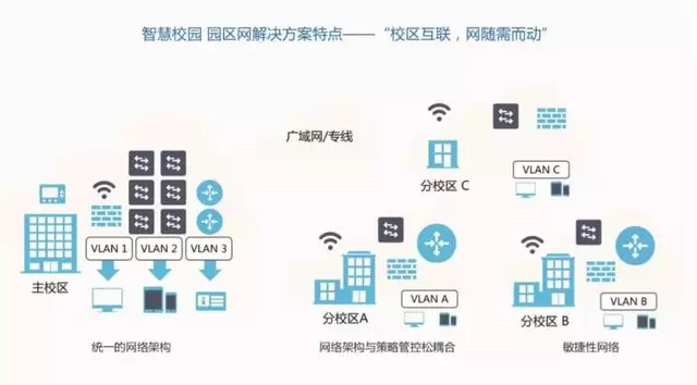正是为了让校园网成为智慧校园底层有力的支撑。浪潮网络推出了”智慧校园一一校园网解决方案”,从”智慧校园”上层应用需求出发,以资源为视角构建、运维管理校园网络资源;打破传统有线/无线网络服务边界,以数据为导向,最终实现让网络平台有力支撑高等院校智能化创新。