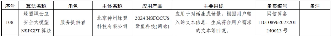 11月1日,国家互联网信息办公室关于发布第八批深度合成服务算法备案信息,绿盟风云卫安全大模型NSFGPT算法(以下简称“NSFGPT算法”)通过备案审查,标志着绿盟风云卫AI安全能力平台在算法有效性、安全性和合规性等方面得到了国家层面的权威认可,进一步为()利用人工智能技术在网络安全领域合法、规范开展服务筑牢合规基础。