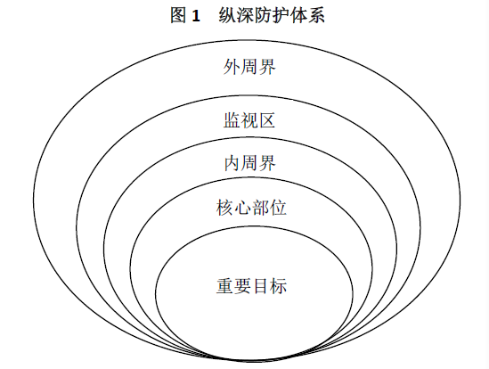 纵深防护通常是依据与核心目标的距离,将防护区域划分为不同的等级,再通过不同防护系统的组合,使得威胁入侵时需要”层层递进”。纵深防护体系可以分为总体纵深防护与局部纵深防护。总体纵深防护以防护目标整体作为对象,将之划分为不同的防护区。以一座居民楼为例,该居民楼及周边一定范围就是总体纵深防护的对象。而局部纵深防护,则是以防护对象中的某一部分或某一区域作为目标,以该小目标为核心,在防护对象中构建纵深防护。纵深防护如图1所示。