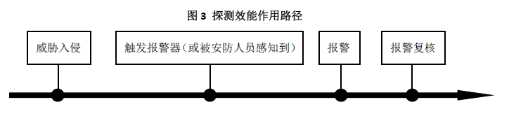 探测是指安防系统中的相关设备或人员发现防护目标所面临的威胁,主要通过探测设备或者安防人员的感官来实现。反映安防系统探测效能的指标主要包括:探测概率、触发报警概率及误报率、探测时间(信息传递时间)等。探测效能的作用路径如下图3所示。