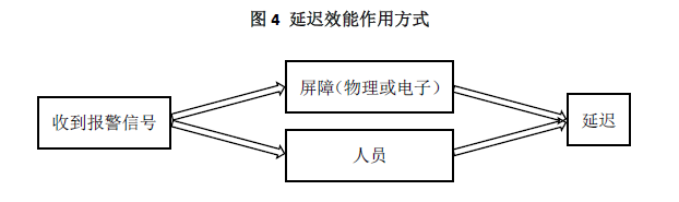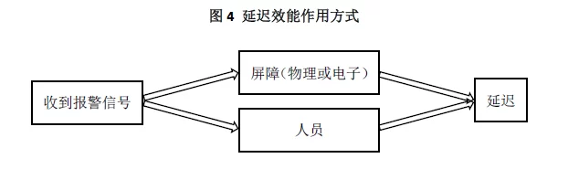 通常情况下,物理屏障在延迟效能中发挥的作用较大,如关闭打门、封闭某些可用于袭击人员通过的通道等。但在针对防护目标信息网络的袭击中,则要依靠电子屏障,如防火墙等。在延迟效能中,安防人员是必不可少的,因为无论是物理或是电子屏障都需要人员来布置或操纵。评估延迟效能主要在于延迟系统为响应人员提供的时间,即通过布置延迟系统前响应人员所拥有的反应时间,与布置延迟系统后响应人员所拥有的反应时间相比较来判断。