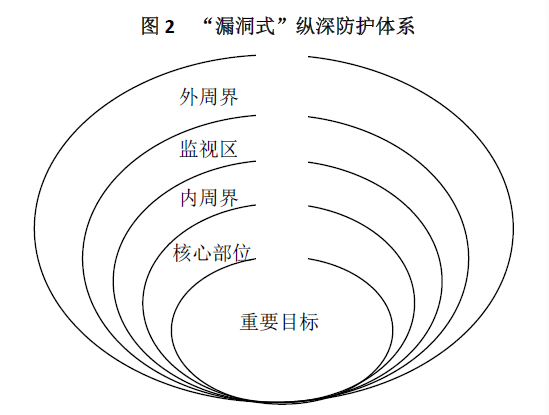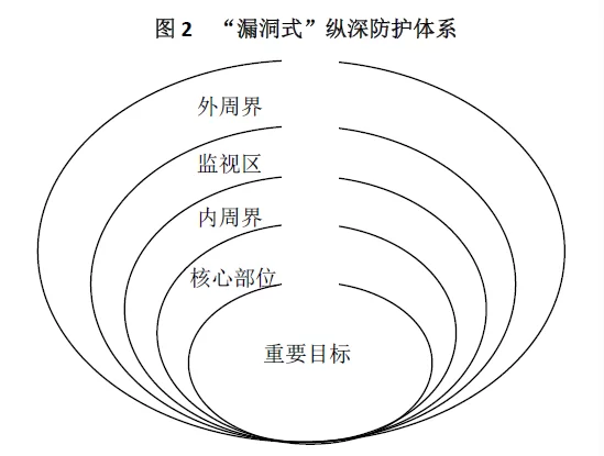 这种纵深防护体系是对传统的纵深防护体系的升级和改进,也需要对防护目标进行层级划分。在此基础上,在每一层安防系统上预留一个”漏洞”,这个漏洞对于威胁而言,看起来是非常容易攻破的,但实际上这些漏洞处的安防力量是最强的。如图2所示。