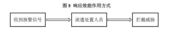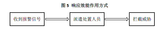 响应是指防护目标中的安防力量对威胁做出反应,以阻止威胁进一步入侵,并最终消除威胁或将威胁赶出防护目标。响应效能主要依靠安防人员来实现,同时也需要一些技防和物防措施提供帮助,如为响应人员提供装备等。评估响应效能主要依靠两个指标:一是从收到报警信息到做出反应所用的时间;二是响应的有效性,即成功阻止威胁入侵的概率。效应效能的作用方式如图5所示。