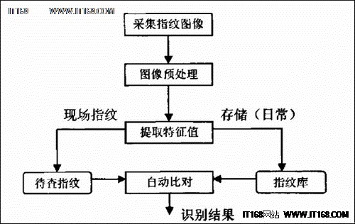 指纹识别系统主要有以下几个环节:指纹图像采集、指纹图像预处理、特征提取、指纹特征匹配,指纹识别流程图如下: