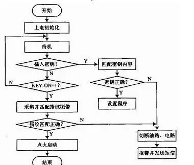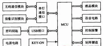 主要工作原理如下:车主停车熄火后,防盗器进入锁定状态。此时如果汽车钥匙不在ON位,就不能进行指纹识别;只有当汽车钥匙在ON位,才可用指纹识别解锁防盗器并自动点火。在锁定状态下,汽车的油路、电路等被切断,汽车钥匙无法点火;如果强行剪断指纹采集模块和控制盒的连线,或者不识别指纹而强行用汽车钥匙点火,汽车会通过鸣号、闪灯和无线通信网络报警。在锁定状态插入密码钥匙可进入解锁状态,并可根据LCD和语音提示通过小键盘进行指纹注册/删除、手机号码设置和应急点火等操作。
