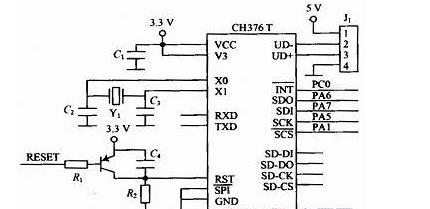 USB接口电路主要由文件管理控制芯片CH376T实现,CH376T支持USB设备方式和USB主机方式,并且内置了USB通信协议的基本固件、处理MassStorage海量存储设备的专用通信协议的固件、SD卡的通信接口固件、FAT16和FAT32以及FAT12文件系统的管理固件,支持常用的USB存储设备和SD卡。CH376T支持二种通信接口:SPI接口和异步串口。本设计采用SPI接口与MCU进行数据通信,电路连接方式如图2所示。串行数据输入SDI、输出SDO和时钟SCK分别接STM32F103VC的SPI1_MOSI,SPI1_MISO和SPI1_SCK,中断请求输出端INT接PC0,片选端SCS由PA1控制。图2中的RESET是系统复位信号,晶体振荡器Y1选12MHz。当车主要进行指纹注册/删除或应急点火时,将密码钥匙(U盘)接入J1以读取密码信息。