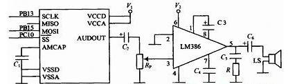 语音电路原理图如图3所示,由美国ISD公司的语音芯片ISD4004-16和美国国家半导体公司的音频功率放大器LM386等元件构成。ISD4004-16录放时间为16min(可分段),它采用CMOS技术,单电源3V工作,内含振荡器、抗混叠滤波器、平滑滤波器、音频放大器、自动静噪及高密度多电平闪烁存贮陈列。它内置微控制器SPI总线串行通信接口。可将模拟语音数据直接写入单个存储单元,不需通过A/D或D/A转换。使得ISD语音电路具有音质自然、使用方便、单片存储、反复录放、低功耗、抗断电等许多优点。LM386工作电压范围宽,电压增益可调。具有自身功耗低、电压增益可调整电源电压范围大、外接元件少和总谐波失真小等特点。本设计中STM32F103VC通过SPI2给ISD4004传送语音信息。图3中的V1和V2分别经三极管与+3.3V和+12V电源相连,三极管的通断由STM32F103VC的PCI1和PCI2控制,只有在需要语音提示时,才使三极管导通给ISD4004和LM386供电。