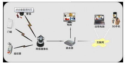 传统的网络摄像机上都有报警(ALARMI/O)接口,这种报警信号接入可以处理开关量电平,因此,这样设备的端子也就可以接能提供开关量电平的各类报警传感设备。当网络摄像机接收到此数据后,可以对其进行编码处理,而后送入TCP/IP网络,通过应用软件对该报警信号进行各种联动响应设置,如发出声、光报警与进行报警录像等。