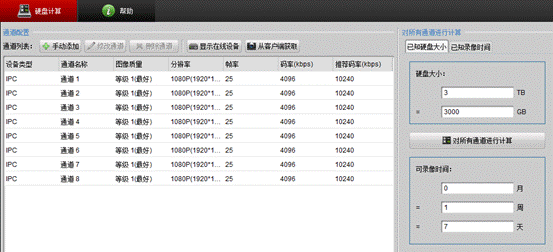 可以看出,该品牌录像机连接了8个200W的IPC,默认码流是4096Kbps,使用了3T的硬盘仅能保存7天的录像。