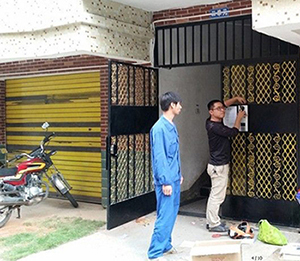 室外对讲门口主机安装时。主机与墙之间为防止雨水进人,要用玻璃胶堵住缝隙,主机安装高度为摄像头距地而1.5m。