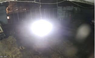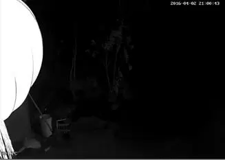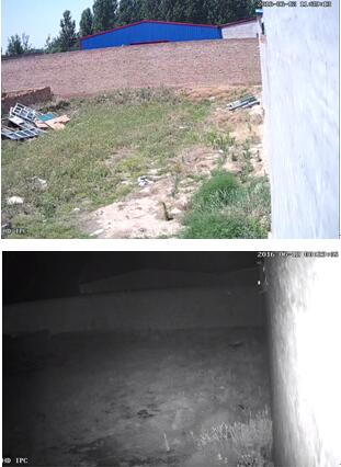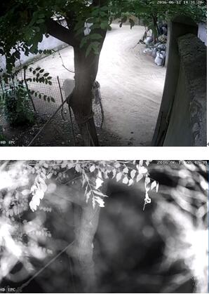此场景摄像机画面边缘有个灯笼,反射了很多的红外光,夜视时会导致灯笼过曝,灯笼很亮,右边画面一片漆黑。