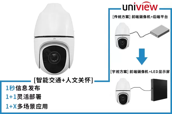 - 1+1灵活部署:前端摄像机和LED显示屏直接联动,从违法抓拍到秒级直观显示车辆违法信息,两步过程一气完成,无需经过后端平台。