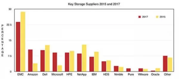 调查数据显示,2017年,企业在云存储的投入将占到企业级存储市场的17%,而2015年为8%。而且,企业在本地存储(相对于云存储)上的花费将从2015年的70%降低到58%,AWS和微软的云存储将是最大的受益者。