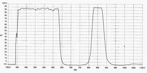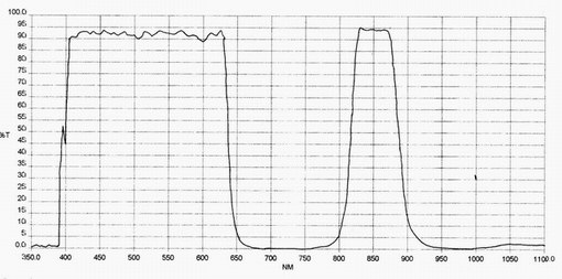 这是滤光片对每个波长光的穿透率,横轴是波长,以奈米(nm)表示,纵轴是穿透率,我们看到从380nm-645nm 穿透率是约93% ,刚好就是可见光的范围(紫-靛-蓝-绿-黄-橙-红),就是彩虹的颜色嘛! 600多nm是红色光,在它往右以”外”,就叫”红外线”,是”红色以外的光” 不是红色的光,因为眼睛已经看不到了,再来,380nm左右我们眼睛看到的是紫色,在380nm往左以”外”,就叫”紫外线”。