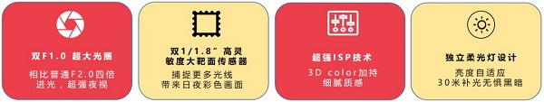180°广角双摄臻全彩摄像机具有超大光圈、超灵敏传感器、独立柔光灯、超强ISP技术等诸多提高夜视性能的设计,不仅为视频画面保留色彩信息,还能更完整、细致地还原现场情况。