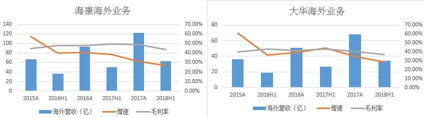 先看数据,无论是营收还是毛利率方面,2018年海康和大华的海外市场在一定程度上都出现了下滑。