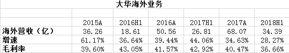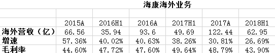 从海康威视中报及年报来看,2018年前三季度,海康威视整体营收达338.02亿元,同比增幅21.90%,小于去年同期增长幅度;另外,海外业务方面的毛利率在今年年中出现小幅回落并低于30%。