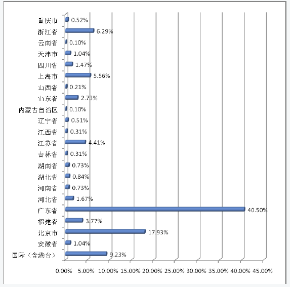 根据组委会统计,2018年安博会总参展企业数量953家,其中国内厂商865家,占总数的90%左右,其中华南地区占44.62%,华东地区占26.13%,华北地区占23.12%,华中地区占2.89%,西南地区占2.32%,东北地区占0.92%。(见下表)