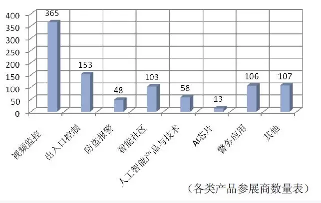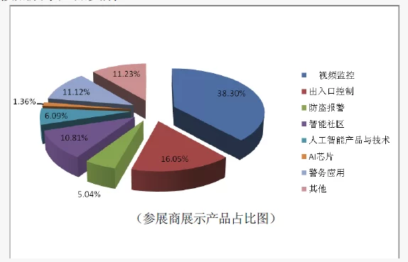 视频监控、出入口控制、防盗报警、智能社区、人工智能产品及技术、AI芯片以及警务产品等。其中视频监控类产品企业占到总企业的38.3%,占据三分之一强;其次为出入口控制类企业达到16.05%,智慧社区以及警务类产品也分别达到10.81%、11.12%。