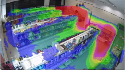 热度图技术(Heat Mapping)可以记录视频中一段时间内消费人群的运动情况,实现消费人群在时间维度上的密度检测,并利用不同的颜色在空间维度上进行展示。以下图为例,红色表示一段时间内顾客比较密集、停留时间比较长的货架区域,蓝色则表示相对人流较少的区域。这样,通过热度图分析技术可以帮助商家了解最受欢迎的商品类型以及将商品摆放在哪些位置可以增加选购的概率,从而提升销售额。