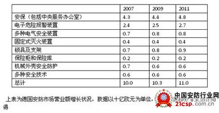 在2009年至2011年,安防市场领域及相关部门营业额经历了一段持续性的稳定增长。通过这个两年间的数据比较,三个领域内的营业额普遍都保持了7%左右的增长。