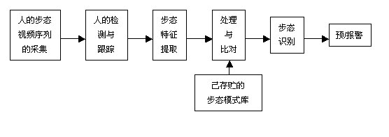 由图1可知,首先由监控摄像机采集人的步态,通过检测与跟踪获得步态的视频序列,经过预处理分析提取该人的步态特征。即对图像序列中的步态运动进行运动检测、运动分割、特征提取等步态识别前期的关键处理。其次,再经过进一步处理,使其成为与己存贮在数据库的步态的同样的模式;最后,将新采集的步态特征与步态数据库的步态特征进行比对识别,有匹配的即进行预/报警。无匹配的,监控摄像机则继续进行步态的采集。